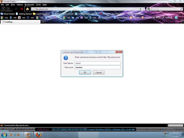 9. Kemudian coba browser di client. ftp.zainul.com (ftp anda). Karena tadi saya memilih anonymous no maka user harus mengisi user name dan password untuk mengakses ftp.